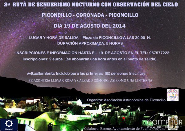 La Asociación Astronómica de Piconcillo, contando con la colaboración del Ayuntamiento de Fuente Obejuna, organiza la celebración de la 2ª Ruta de Senderismo Nocturno con Observación del Cielo, el próximo día 19 de agosto.