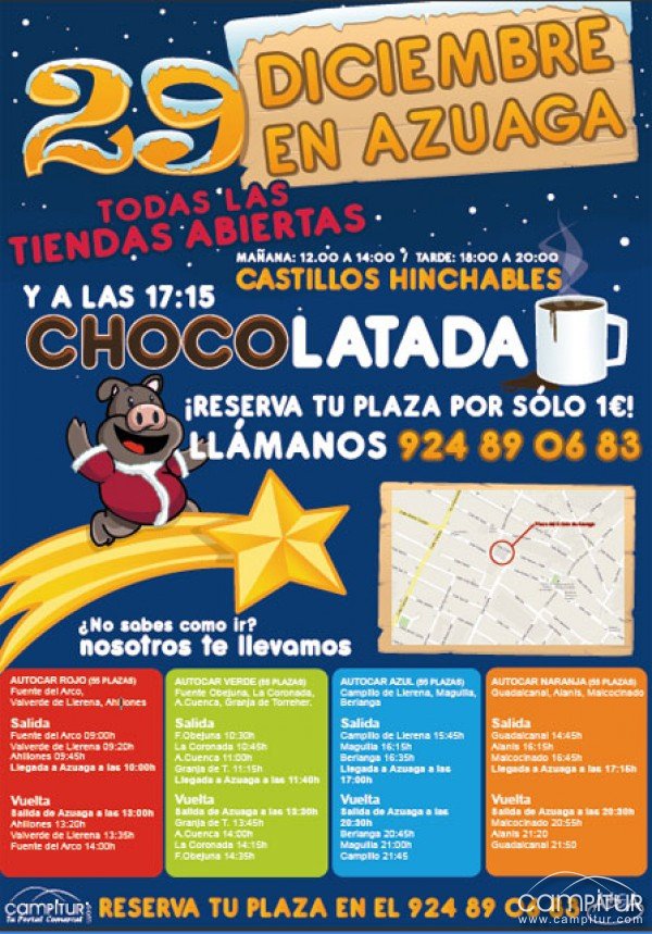 En la plaza del Cristo de Azuaga habrá instalados castillos hinchables por tan solo 1 euros, en horario de 12: 00 a 14:00 horas y de 18:00 a 20:00 horas. Además, a partir de las 17:15 horas en el mismo lugar, el CD Azuaga organiza una Chocolatada de la que podrán disfrutar todos los presentes que lo deseen.