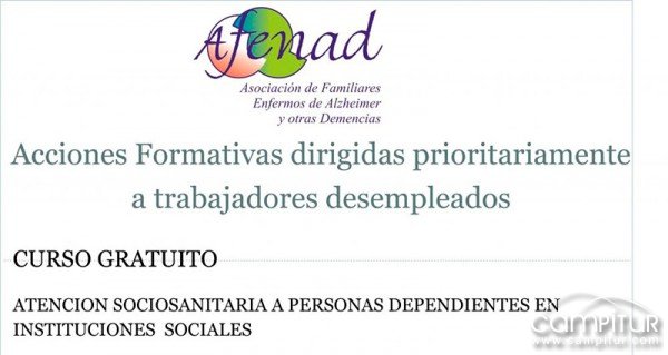 Desde la Asociación de Familiares Enfermos de Alzheimer y otras Demencias (AFENAD) de Llerena informan que van a llevar a cabo la impartición de un curso gratuito denominado “Atención sociosanitaria a personas dependientes en instituciones sociales”, en las localidades de Azuaga y Llerena, simultáneamente.