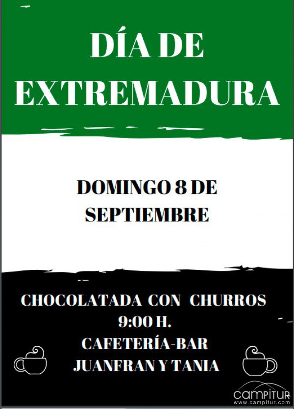 El domingo, 8 de septiembre, el municipio festeja el Día de Extremadura con la degustación de churros y chocolates en la Cafetería Bar Juanfran y Tania, a partir de las 09:00 horas