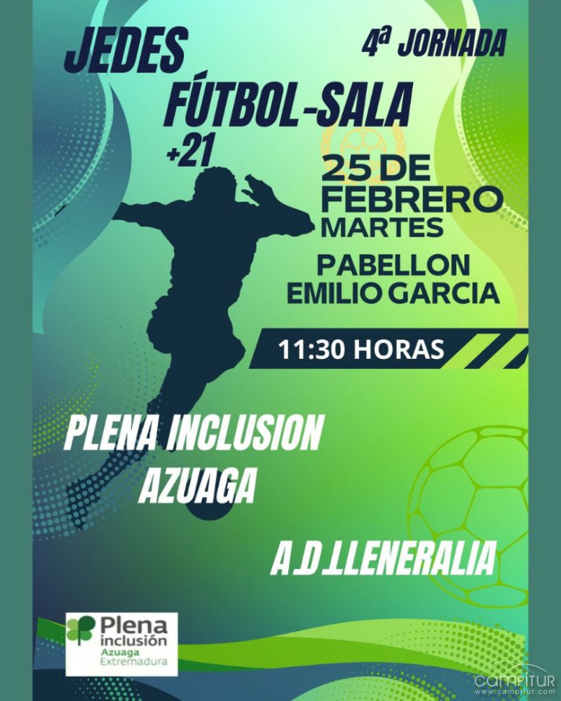 El martes 25 de febrero, Azuaga acogerá la 4ª jornada de los JEDES en la disciplina de Fútbol Sala +21, un evento de inclusión deportiva que se celebrará en el Pabellón Emilio García a las 11:30 horas. En esta ocasión, el equipo de Plena Inclusión Azuaga se enfrentará a A.D. Lleneralia.