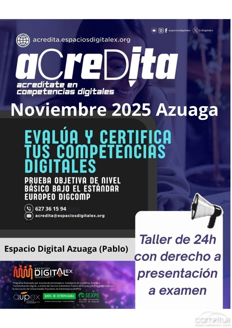 El próximo mes de noviembre de 2025, el Espacio Digital Azuaga (Pablo) será sede del programa “Acredita”, una iniciativa que permitirá a los participantes evaluar y certificar sus competencias digitales a través de una prueba objetiva de nivel básico, basada en el marco europeo DigComp.