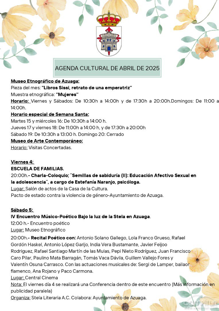 El Ayuntamiento de Azuaga ha presentado su Agenda Cultural y Deportiva para abril de 2025, una programación repleta de actividades para todos los públicos que combina cultura, deporte, educación y ocio a lo largo de todo el mes.