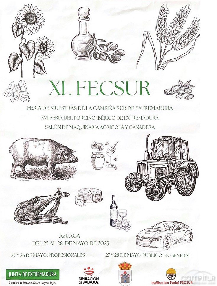 Como viene siendo tradición, el último fin de semana de mayo, Azuaga celebra la que este año alcanza la XL edición, su feria Fecsur así como la XVI Feria del Porcino Ibérico en Extremadura, Salón de Maquinaria Agrícola y Ganadera y VI Concentración de Rehalas.