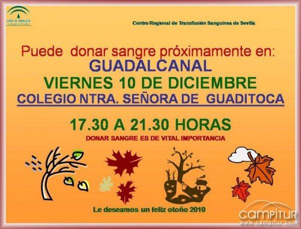 El próximo viernes 10 de diciembre, la localidad sevillana de Guadalcanal desarrollará una campaña de donación de sangre. El lugar donde se realizará será en el Colegio de Nuestra Señora de Guaditoca, en el horario de 17:30 a 21:30 horas. Se necesita sangre de todos y cada uno de los grupos, y especialmente de 0 positivo y 0 negativo.