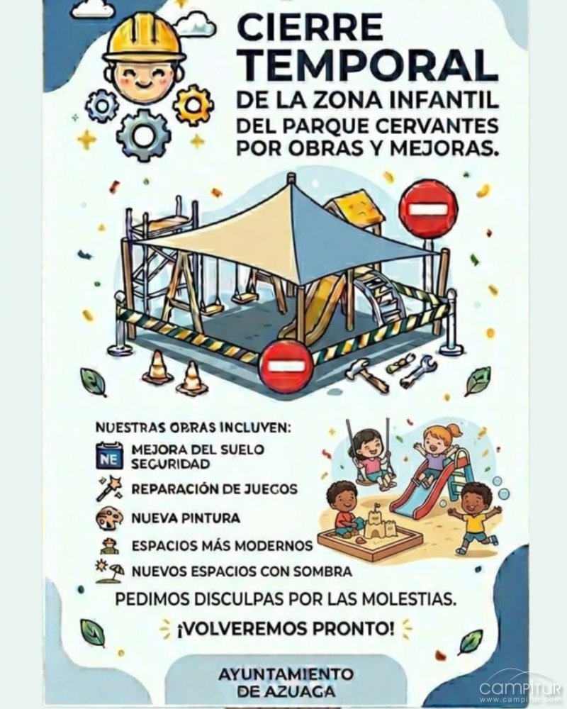 El Ayuntamiento de Azuaga ha comunicado que, desde el próximo 7 de abril, la zona infantil del Parque Cervantes permanecerá cerrada de manera temporal con motivo de una actuación de reparación y mejora en este espacio destinado al ocio de los más pequeños.