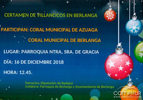 El domingo, 16 de diciembre, la Parroquia de Nuestra Señora de Gracia de Berlanga acogerá la celebración del tradicional Certamen de Villancicos, que en esta ocasión contará con la participación, junto a la Coral Municipal de Berlanga, de la Coral Municipal de Azuaga.