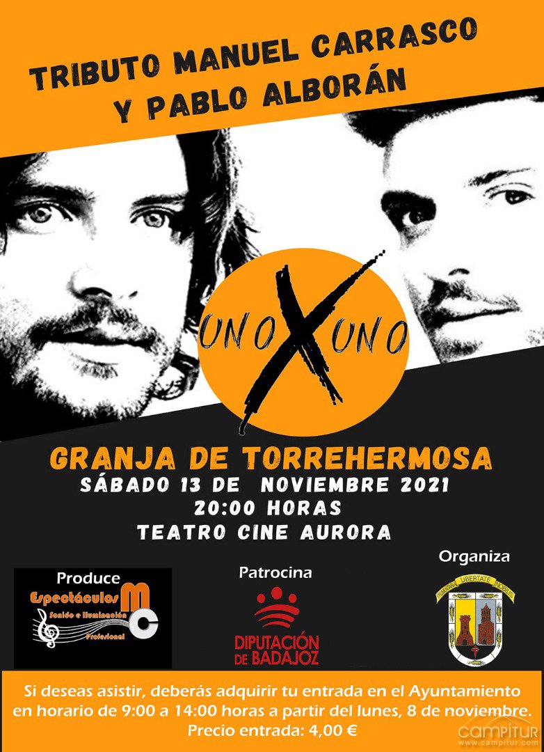 El próximo sábado, 13 de noviembre, a las 20:00 horas, el Teatro Cine Aurora de Granja de Torrehermosa acogerá un concierto de música, bajo en nombre de “Uno x Uno”, a través del cual se rinde tributo a los cantantes Pablo Alborán y Manuel Carrasco.