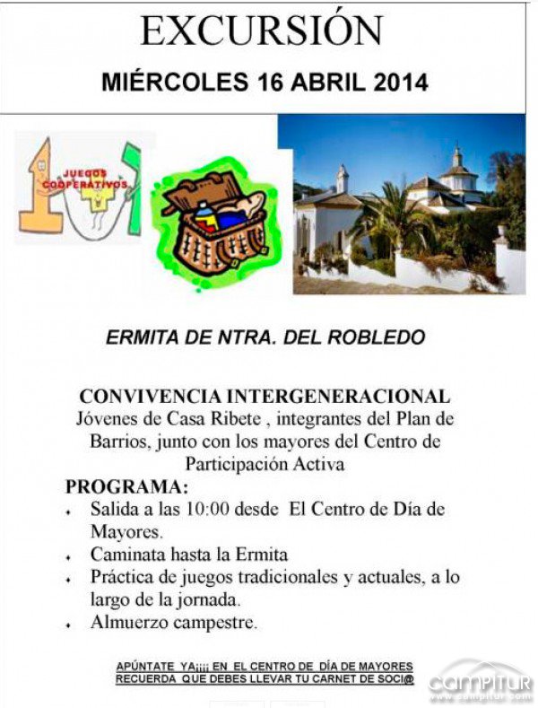 El próximo miércoles, 16 de abril tendrá lugar en Constantina una Convivencia Intergeneracional del Centro de Participación Activa de Mayores, Casa RBT y Plan de Barrios en la Ermita del Robledo.