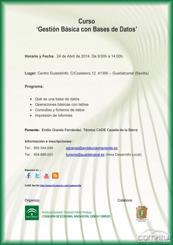 Organizado por la Fundación Pública Andaluza, Andalucía Emprende, y contando con la colaboración del Ayuntamiento de Guadalcanal, se va a celebrar en esta localidad un curso de Gestión Básica con Bases de Datos.