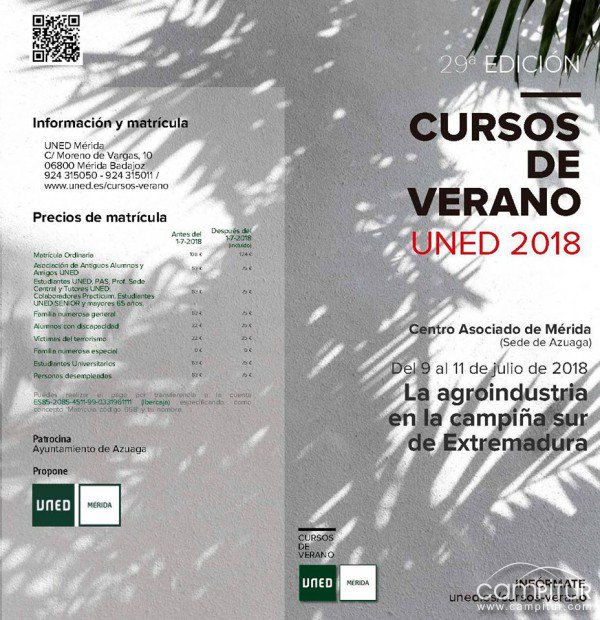 El plazo para formalizar la matrícula para el Curso de Verano de la UNED “La Agroindustria en la Campiña Sur” que se impartirá en el aula de Azuaga del 9 al 11 de julio, permanece abierto.