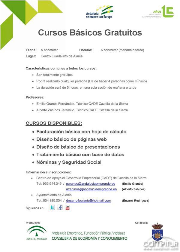 Todas estas formaciones son gratuitas, y están dirigidas a todos los públicos, al menos ha de haber inscritas 4 personas para que se lleven a cabo, siendo la duración de los mismos de 5 horas, impartidas de forma interrumpida en una sola sesión en el Centro Guadalinfo de Alanís.