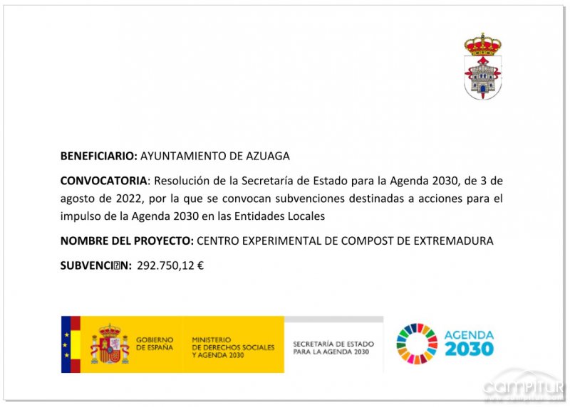 El abono natural se ha obtenido a través de las líneas de investigación ejecutadas en el proyecto “Centro Experimental de Compost de Extremadura” por el que el Ayuntamiento de Azuaga recibió una subvención de 292750,12 € del Ministerio de Asuntos Sociales y Agenda 2030.