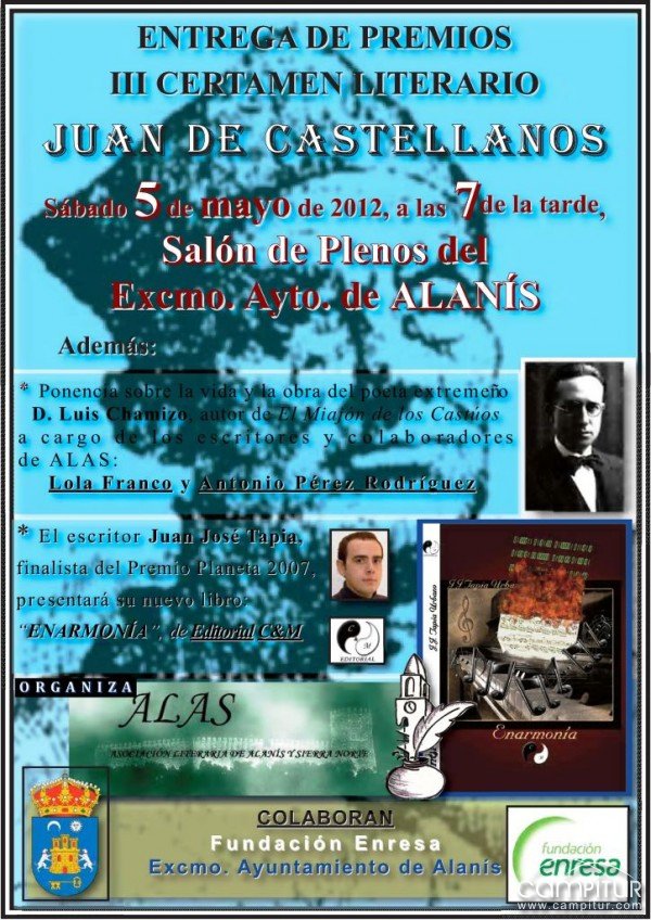 El sábado, 5 de mayo, el Salón de Plenos del Ayuntamiento de Alanís acogerá la celebración del Acto de entrega de premios de la III Edición del Certamen Literario Escolar “Juan de Castellanos de Alanís”.