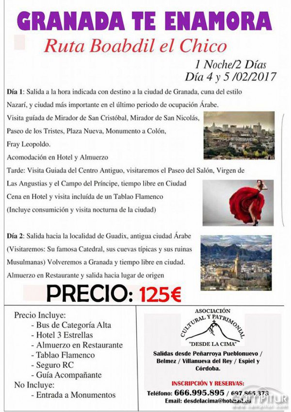 La Asociación Cultura Desde la Cima de Peñarroya – Pueblonuevo organiza una nueva actividad, consistente en una excursión a Granada, los días 4 y 5 de febrero, donde los participantes podrán disfrutar de la Ruta Boabdil El Chico.