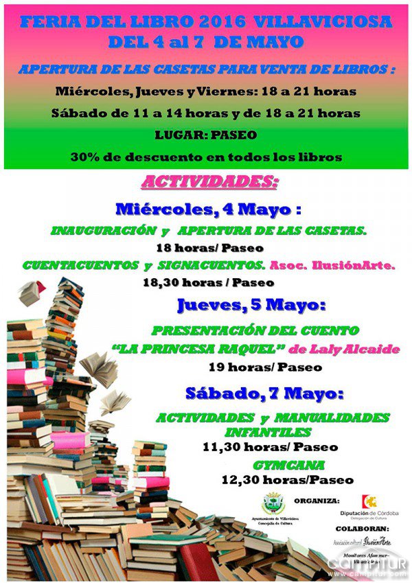 Villaviciosa de Córdoba acoge la celebración durante los próximos días 4, 5, 6 y 7 de mayo, de su Feria del Libro. El horario de visita de la misma será de 18:00 a 21:00 horas el miércoles, jueves y viernes, y de 11:00 a 14:00 horas y de 18:00 a 21:00 el sábado.