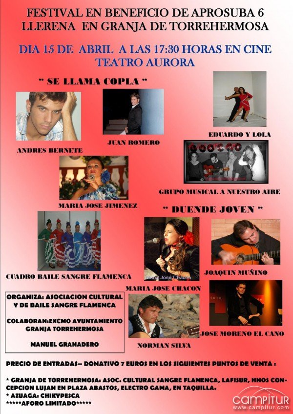 El domingo, día 15 de abril, el Teatro Cine Aurora de Granja de Torrehermosa acogerá a partir de las 17:30 horas un Festival Benéfico a Beneficio de Aprosuba 6 de Llerena, organizado por la Asociación Cultural y de Baile Sangre Flamenca.