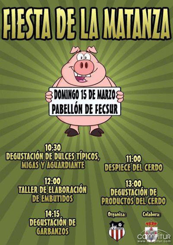 El Club deportivo Azuaga, en colaboración con el Excmo. Ayuntamiento de Azuaga, organizan para el próximo domingo, 15 de marzo, la Fiesta de la Matanza en el pabellón de Fecsur de la localidad.