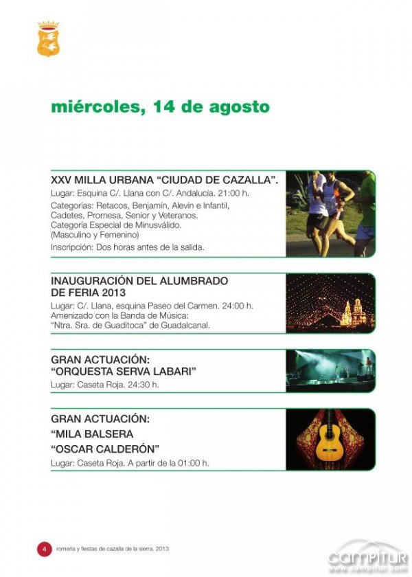 Del 15 al 18 de agosto, Cazalla de la Sierra celebra sus fiesta patronales 2013, como el resto de localidades, un completo programa de actividades se desarrollarán a lo largo de estos días, programación que os detallamos a continuación:
