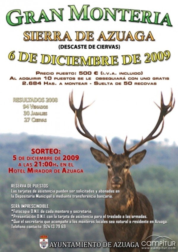 Como viene siendo ya tradición, la ciudad de Azuaga tiene previsto la celebración de su Gran Montería en la Sierra de dicho municipio a principio del mes de diciembre.