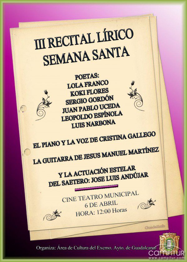 El domingo, 6 de abril, a partir de las 12:00 horas, el Cine Teatro Municipal de Guadalcanal acoge la celebración del III Festival Lírico de Semana Santa.