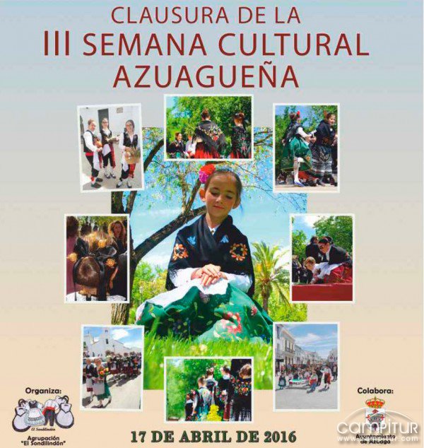 La semana del 11 al 17 de abril, la localidad azuagueña conmemora su Semana Cultural del Folklore con la puesta en marcha de numerosos actos, festejos que llegan a su fin con la celebración el domingo, 17 de abril, de la Clausura de la III Semana Cultural de Folklore en Azuaga.