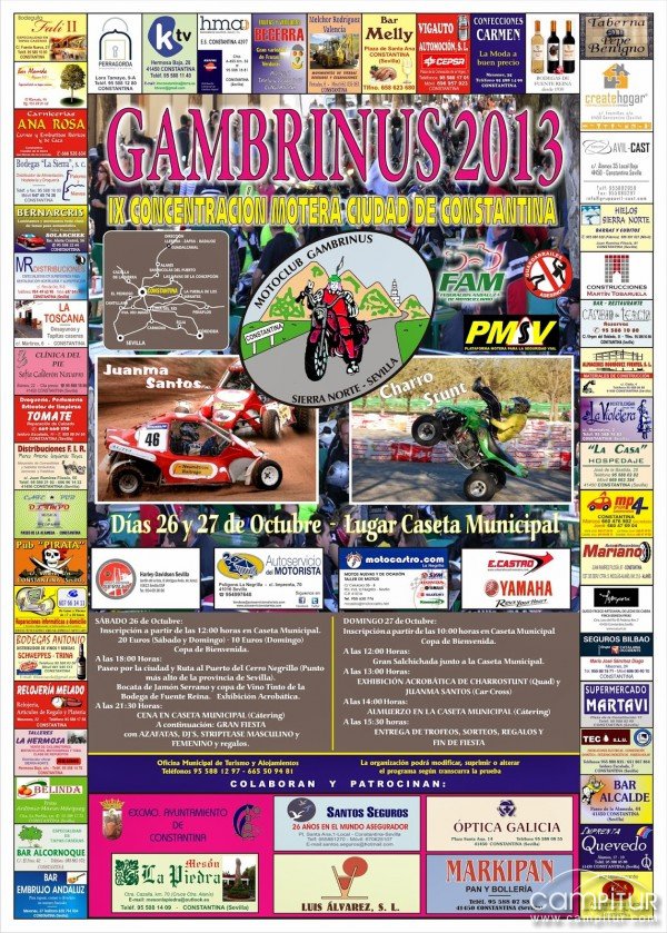 El último fin de semana de octubre, el 26 y 27, sábado y domingo, Constantina acoge nuevamente la que este año alcanza su IX Concentración Motera “Gambrinus 2013”, organizada por Motoclub Gambrinus y contando con la colaboración del Ayuntamiento de la localidad.