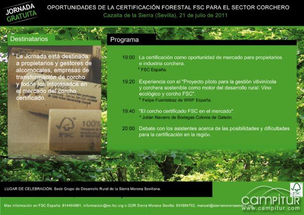 FSC España organiza una Jornada sobre "Oportunidades de la certificación forestal FSC para el sector corchero" que se celebrará el próximo día 21 de julio de 2011 en Cazalla de la Sierra (Sede Grupo de Desarrollo Rural de la Sierra Morena Sevillana, Pol. Ind. Los Manantiales, Edificio Victorio y Lucchino).