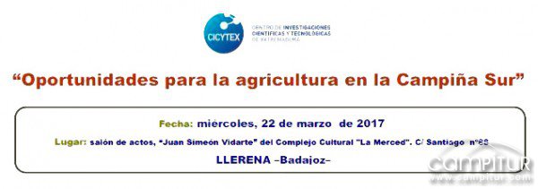 Llerena acoge el miércoles, 22 de marzo, unas Jornadas Formativas para Agricultores, organizadas por el Centro de Investigaciones Científicas y Tecnológicas de Extremadura (CICYTEX), que tratará sobre “Oportunidades para la agricultura de la Campiña Sur”.