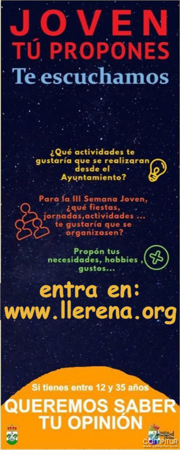 Desde la Concejalía de Juventud del Ayuntamiento de Llerena han iniciado una campaña con la que buscar ideas y propuestas de la población más joven. De modo que han habilitado un cuestionario para que este colectivo pueda expresar qué actividades prefiere, con qué contenido programaría la III Semana de la Juventud, cuáles son sus necesidades, así como sus preferencias horarias y espacios preferidos en la localidad donde acoger y celebrar los eventos que se organicen para dicho público.