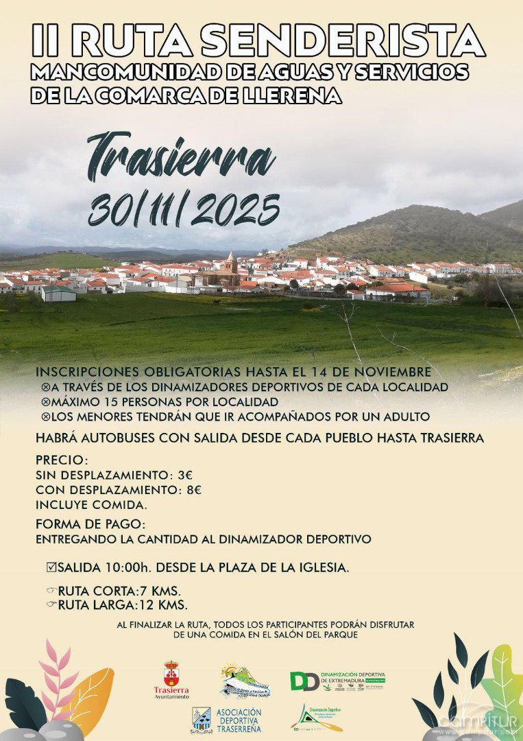 La II Ruta Senderista de la Mancomunidad de Aguas y Servicios de la Comarca de Llerena se celebrará el próximo 30 de noviembre de 2025 en Trasierra, ofreciendo una jornada de deporte, naturaleza y convivencia para vecinos y visitantes.