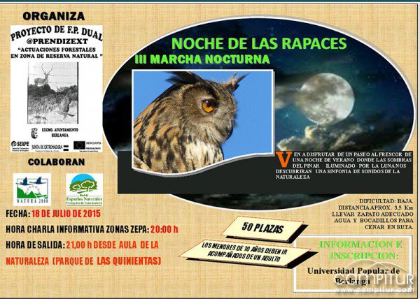 Hoy lunes, 18 de julio, el Aula de la Naturaleza del Parque de Las Quinientas de Berlanga, lleva a cabo la actividad “La Noche de los Rapaces.III Marcha Nocturna”.