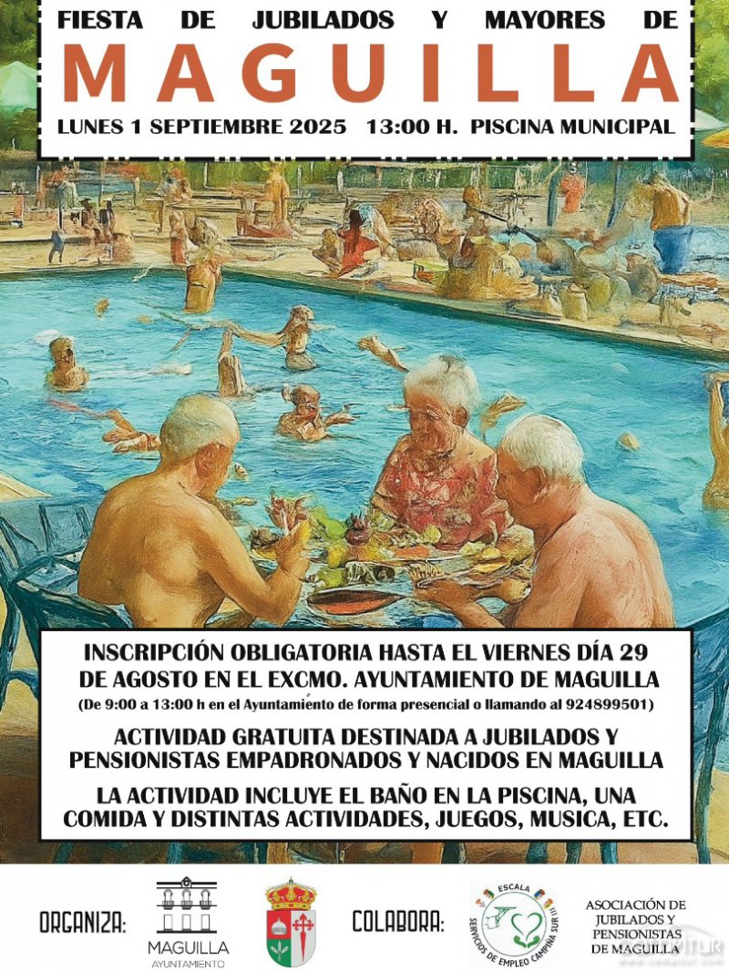 El próximo lunes 1 de septiembre de 2025, a partir de las 13:00 horas, la localidad de Maguilla acogerá en su piscina municipal la tradicional Fiesta de Jubilados y Mayores, una jornada de convivencia organizada por el Ayuntamiento y destinada a los jubilados y pensionistas empadronados o nacidos en el municipio.