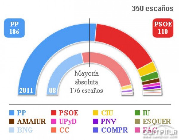 • Senado (208 escaños): El PP ha conseguido 136 escaños y el PSOE 48, frente a los 101(PP) y 88 (PSOE) escaños conseguidos por ambos partidos en 2008.