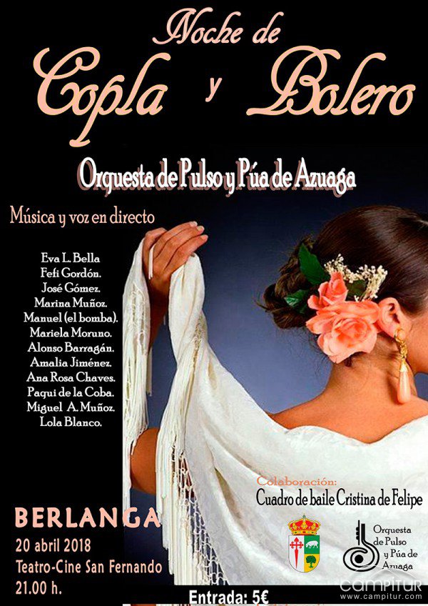 La Orquesta de Pulso y Púa de Azuaga de nuevo en esta ocasión cederá parte del protagonismo, a ese otro maravilloso instrumento como es la voz, acompañando musicalmente a cantantes tanto de Azuaga como de Berlanga, algunos ya de reconocida trayectoria por relacionarse con otros grupos musicales como son: Alonso Barragán, Ana Rosa Cháves, Amalia Jiménez, Eva Leonor Bella, Marina Muñoz, José Gómez, Mariela Moruno, Manuel Gómez “el bomba”, Fefi Gordón, Ana Rosa Chaves, Lola Blanco. Todos ellos interpretarán un repertorio preparado especialmente para esta Noche de Copla, de piezas tan clásicas y conocidas como “La bien pagá” de Ramón Perelló; “La Zarzamora”,  “Me embrujaste” de Quintero, León y Quiroga; “Tengo miedo”, del Maestro Solano Juan Dapaena; “En tierra extraña”, de Manuel Penella; “Habanera de Cádiz”, de Carlos Cano; entre otras coplas muy conocidas, boleros tan oídos como “La gata bajo la lluvia” de Rafael Pérez Botija; “Historia de una amor” de Carlos Eleta, “Piensa en mí” de Agustín Lara, etc. Todos los temas arreglados y adaptados por el Director de la Orquesta, Miguel Ángel Muñoz Blázquez.