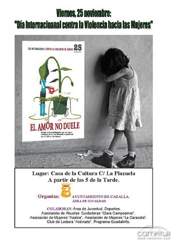 Desde el Área de Igualdad del Ayuntamiento de Cazalla de la Sierra, se han organizado una serie actos que se llevarán a cabo durante toda esta semana con motivo de la celebración del Día Contra la Violencia hacia las Mujeres, que se conmemora el 25 de noviembre.