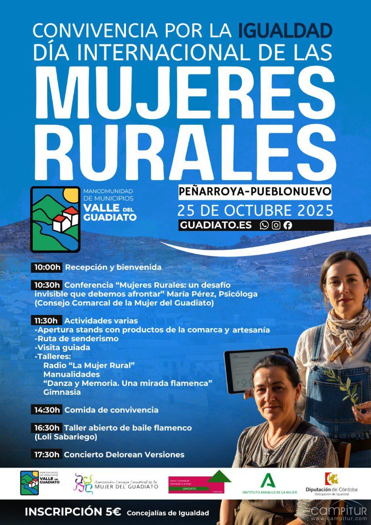 La Mancomunidad de Municipios Valle del Guadiato ha organizado una jornada de convivencia por la igualdad con motivo del Día Internacional de las Mujeres Rurales, que tendrá lugar el sábado 25 de octubre de 2025 en Peñarroya-Pueblonuevo. La cita pretende visibilizar el papel esencial de las mujeres en el desarrollo del medio rural y crear un espacio de encuentro, reflexión y disfrute colectivo.