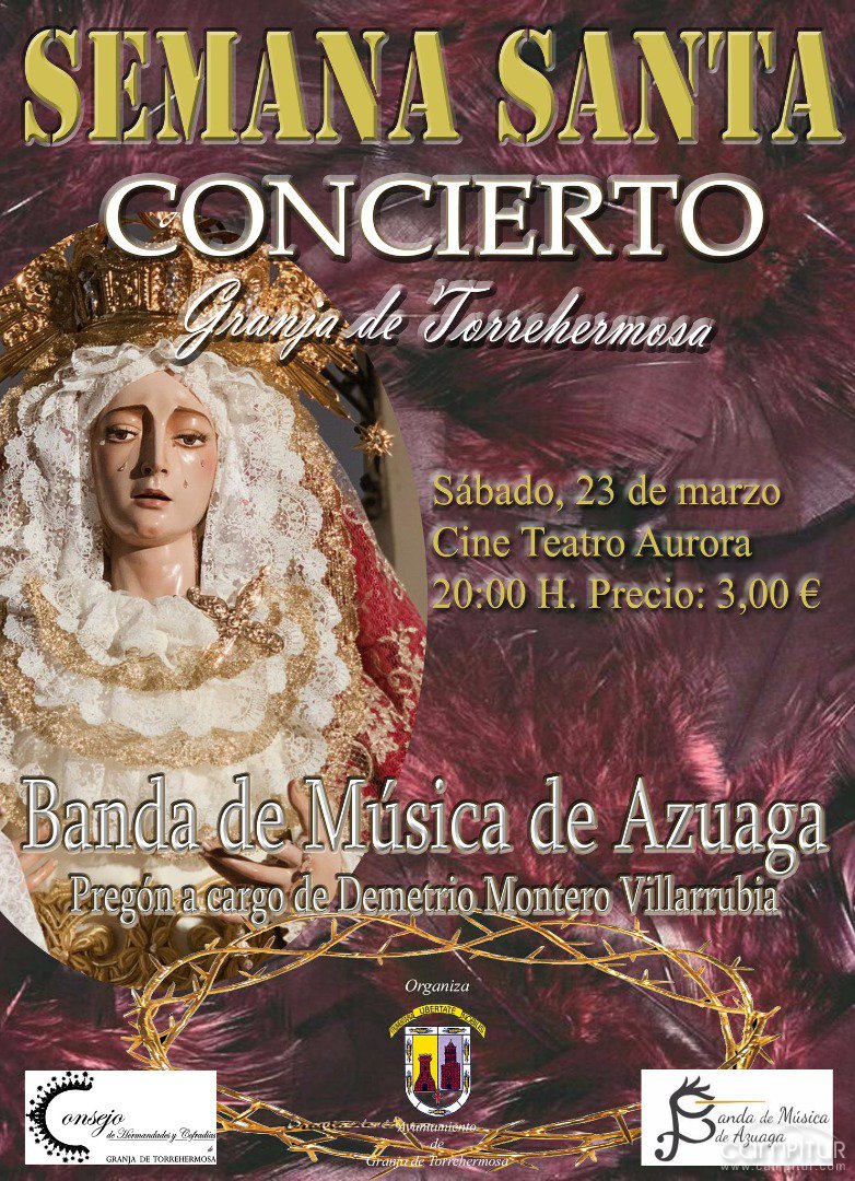 Con el motivo de la celebración de la Semana Santa a final de marzo, la concejalía de Cultura del Ayuntamiento de Granja de Torrehermosa ha organizado la celebración de un Concierto de Semana Santa, el día 23 de marzo, sábado, a las 20:00 horas, en el Cine Teatro Aurora de la localidad.