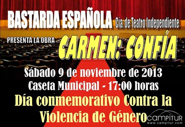 La Concejalía de Igualdad y Cultura de Villanueva del Rey, contando con la colaboración de la Diputación de Córdoba, ha organizado con motivo de la celebración del Día Internacional contra la Violencia de Género que se conmemora cada 25 de noviembre, la representación de la obra de teatro “Carmen: confía”.