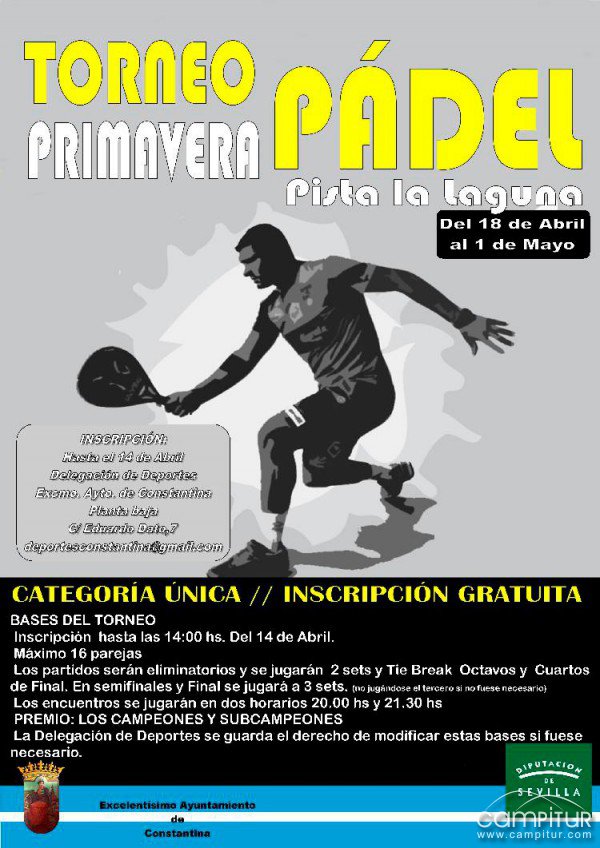 Una vez más, desde la Delegación de Deportes del Ayuntamiento de Constantina se ha organizado la celebración de un Torneo de Pádel de Primavera, que se disputará en la pista de La Laguna, entre los días 18 de abril y 1 de mayo.