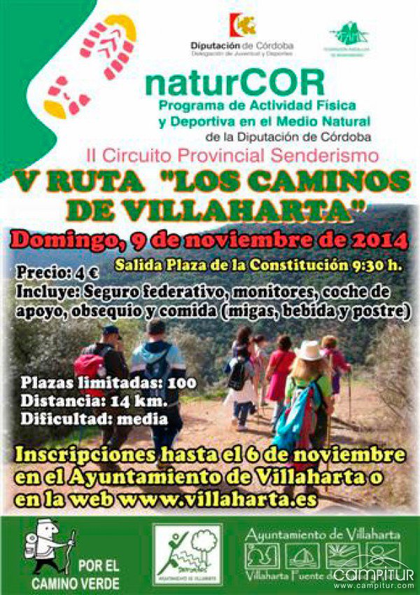 Dentro de NaturCor Programa de Actividad Física y Deportiva en el Medio Rural de la Diputación de Córdoba, y enmarcada en el II Circuito Provincial de Senderismo, Villaharta acoger el próximo domingo, 9 de noviembre, la puesta en marcha de la V Ruta “Los Caminos de Villaharta”.