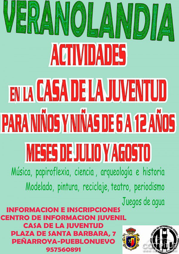 El Centro de Información Juvenil de la Casa de la Juventud del Ayuntamiento de Peñarroya-Pueblonuevo informa de la celebración durante estos meses de verano, julio y agosto, de la actividad Veranolandia.