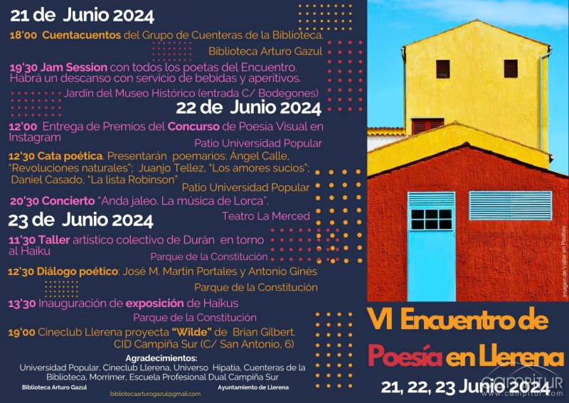 Además de la Jam Session, el VI Encuentro de Poesía en Llerena incluye una variada programación de actividades que se extenderá del 21 al 23 de junio de 2024. Entre ellas, se destacan el Cuentacuentos del Grupo de Cuenteras de la Biblioteca Arturo Gazul, el concierto "Anda jaleo. La música de Lorca", talleres artísticos, diálogos poéticos y la proyección del cineclub Llerena con la película "Wilde" de Brian Gilbert.