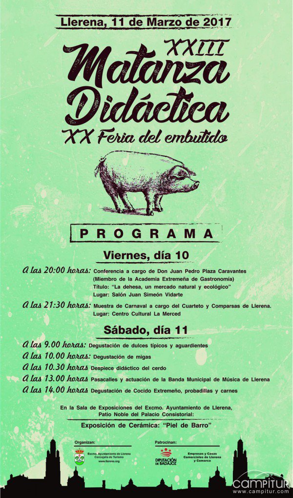 El próximo sábado, 11 de marzo, Llerena acoge la celebración de la XXIII Matanza Didáctica y XX Feria del Embutido, y para ello, desde el Ayuntamiento de la localidad se han programado multitud de actividades, las cuales se extenderán al viernes 10 de este mes.