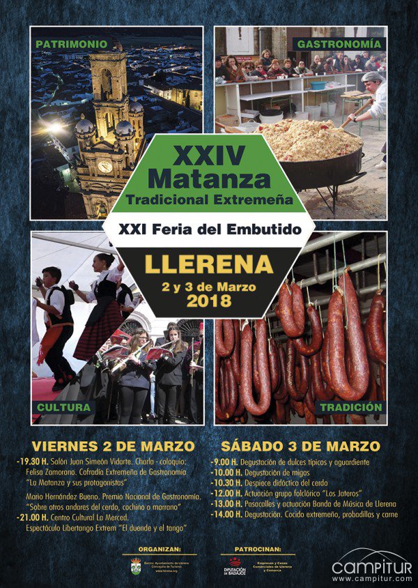 Los próximos días 2 y 3 de marzo, Llerena acoge la celebración, una año más, de la XXIV Matanza Tradicional Extremeña y XXI Feria del Embutido. Y para ello, como en ediciones anteriores, se ha elaborado un completo programa de actividades que os detallamos a continuación.