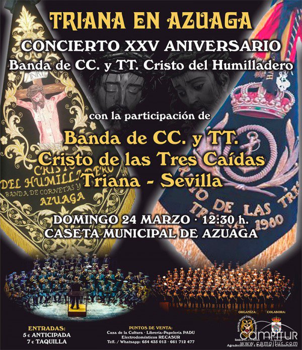 El domingo, 24 de marzo, Azuaga acoge la celebración de un Concierto de Marchas Procesionales, organizado por la Banda de Cornetas y Tambores Cristo del Humilladero de Azuaga y que contará con la participación de la “Banda de las Tres Caídas de Triana de Sevilla”.